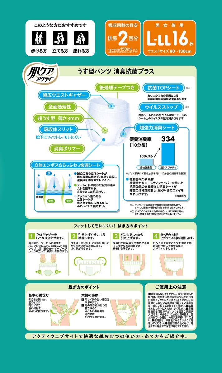肌ケアアクティ 大人用おむつ うす型パンツ 消臭抗菌プラス 約2回分 L-LL (16枚入×4セット)のレビュー