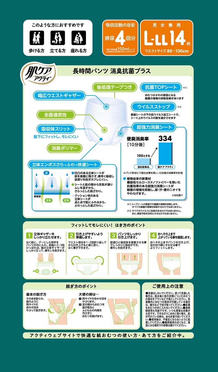 肌ケアアクティ 大人用おむつ 長時間パンツ 消臭抗菌プラス 約4回分 L-LL (14枚入×4セット)
