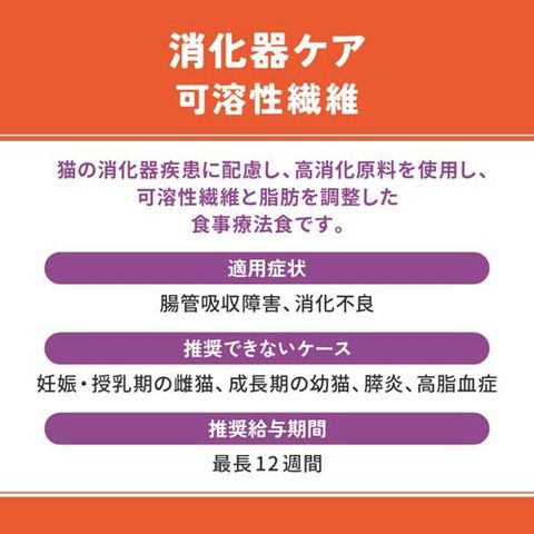 ●「VetsWell 消化器ケア 可溶性繊維」は猫の消化器疾患に配慮し、特別に調製された食事療法食です。