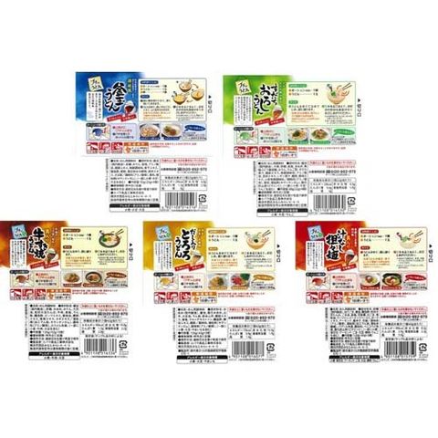 | 釜玉うどん/1袋(23g*4個)、すだちおろしうどん/1袋(22g*4個)、だし入りとろろうどん/1袋(42g*3個)、具入り牛すき焼うどん/(42g*3個)、汁なし担々麺/(40g*3個) 計5種5袋 |