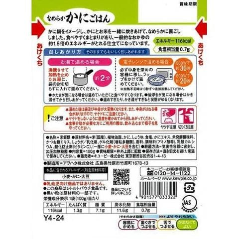 | 米(国産)、植物油脂、かに、しょうゆ、食塩、かにエキス、米発酵調味料、かつお節エキス、しょうが/乳化剤、ゲル化剤(増粘多糖類)、香料、調味料(アミノ酸等)、乳酸カルシウム、酸化防止剤(ビタミンC)、(一部に小麦・かに・大豆を含む) |