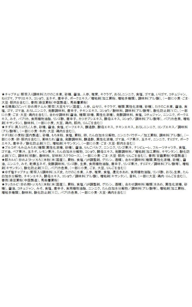 | ★チャプチェ:小麦、ごま、大豆、豚肉 ★石焼風ビビンバ:小麦、ごま、大豆、鶏肉、豚肉、りんご ★チヂミ:小麦、卵、牛肉、ごま、大豆、鶏肉、豚肉 ★プルコギ:小麦、ごま、大豆、豚肉、りんご ★豚カルビ:小麦、ごま、大豆、りんご ★ゆず塩チャプチェ:大豆、鶏肉、りんご ★タッカルビ:小麦、大豆、鶏肉 |