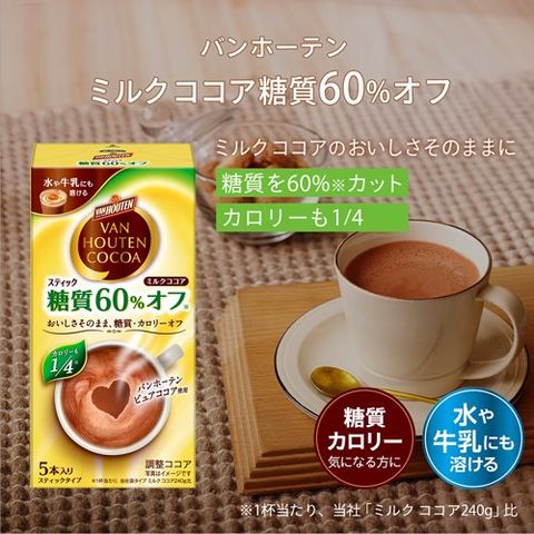 ●ミルク ココアのおいしさそのままに、糖質を60%*カット、カロリーも1/4*(※メーカー比)。