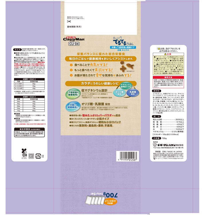 ●下部尿路の健康維持に配慮しマグネシウム標準値0.12%に抑えた低マグネシウム設計。お腹の健康維持にオリゴ糖・乳酸菌配合。