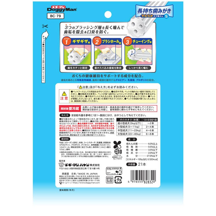 ●歯垢を絡めとる特殊食物繊維、歯周の健康を維持するグロビゲン、乳酸菌、プロポリスを配合。超小型・小型犬向けサイズ。