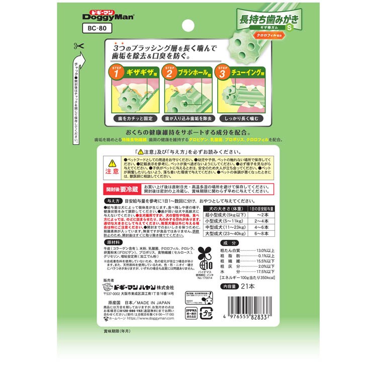 ●歯垢を絡めとる特殊食物繊維、歯周の健康を維持するグロビゲン、乳酸菌、プロポリス、クロロフィルを配合。超小型・小型犬向けサイズ。