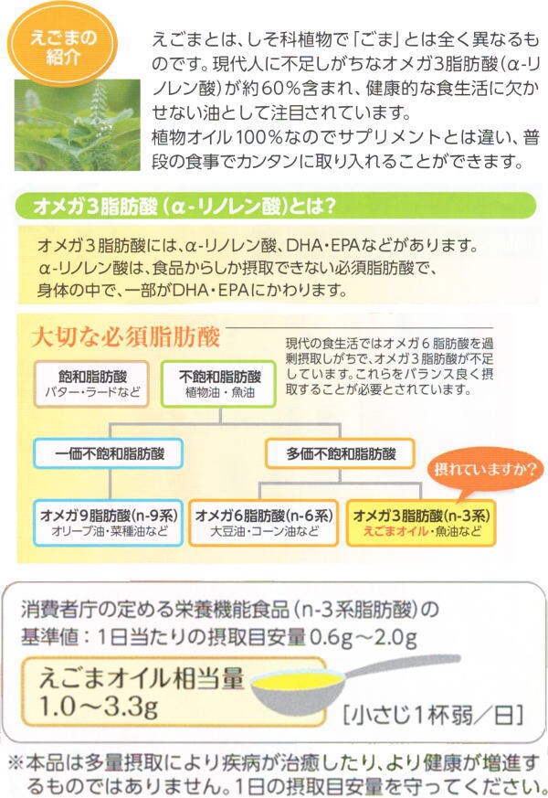 | 食用えごま油、酸化防止剤(ビタミンC、ビタミンE) |
