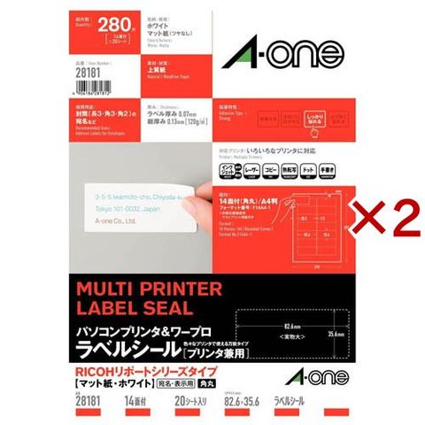 エーワン ラベルシール パソコン ワープロ RICOH リポート 14面 82.6×35.6mm 28181 (20シート入×2セット)