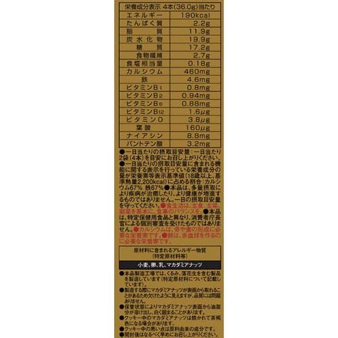 | 4本(36.0g)当たり エネルギー:190kcal、たんぱく質:2.2g、脂質:11.9g、炭水化物:19.9g、糖質:17.2g、食物繊維:2.7g、食塩相当量:0.18g、カルシウム:460mg、鉄:4.6mg、ビタミンB1:0.8mg、ビタミンB2:0.94mg、ビタミンB6:0.88mg、ビタミンB12:1.6μg、ビタミンD:3.8μg、葉酸:160μg、ナイアシン:8.8mg、パントテン酸:3.2mg |