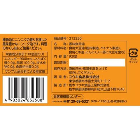 | 食用大豆油(国内製造、ベトナム製造)、食用こめ油、にんにく、(一部に大豆を含む) |