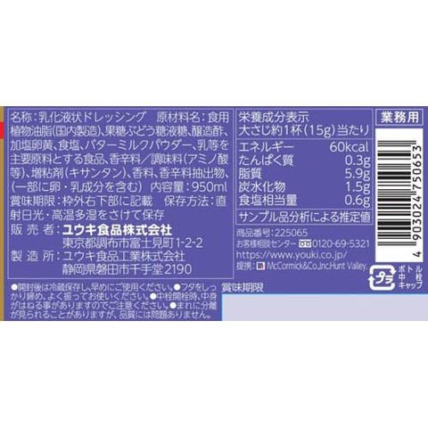 | 食用植物油脂(国内製造)、果糖ぶどう糖液糖、醸造酢、加塩卵黄、食塩、バターミルクパウダー、乳等を主要原料とする食品、香辛料/調味料(アミノ酸等)、増粘剤(キサンタン)、香料、香辛料抽出物、(一部に卵・乳成分を含む) |