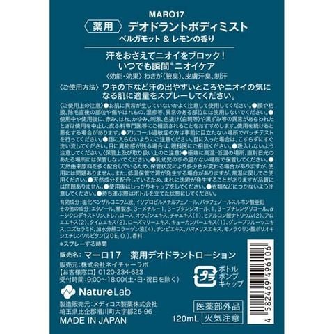 【MARO17 薬用デオドラントボディミスト ベルガモット&レモンの香りの商品詳細】