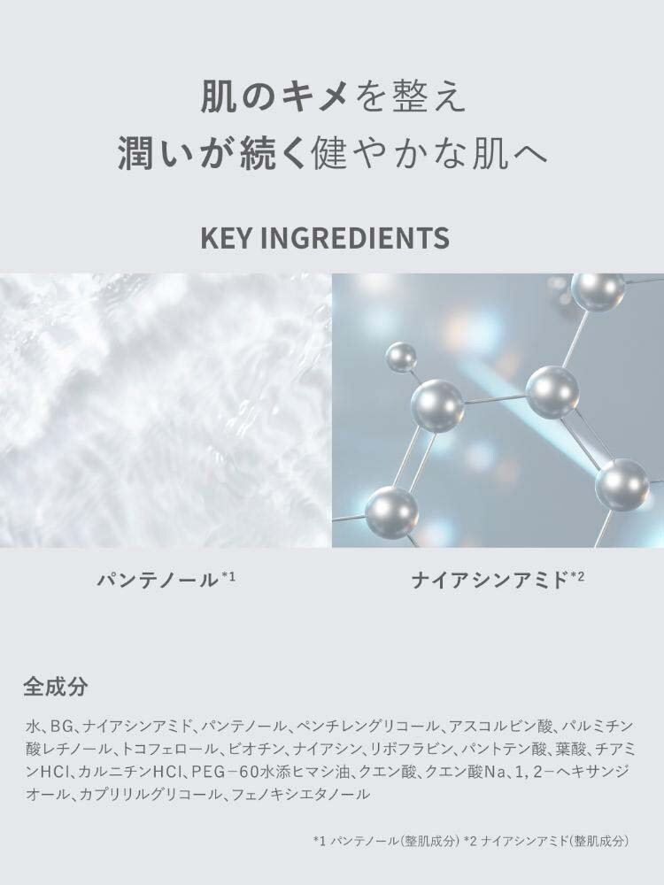 | 水、BG、ナイアシンアミド、パンテノール、ペンチレングリコール、アスコルビン酸、パルミチン酸レチノール、トコフェロール、ビオチン、ナイアシン、リボフラビン、パントテン酸、葉酸、チアミンHCI、カルニチンHCI、PEG-60水添ヒマシ油、クエン酸、クエン酸Na、1、2-ヘキサンジオール、カプリリルグリコール、フェノキシエタノール |