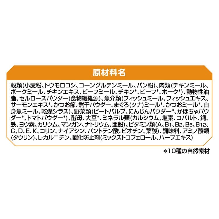 穀類(小麦粉、トウモロコシ、コーングルテンミール、パン粉)、肉類(チキンミール、ポークミール、チキンエキス、ビーフミール、チキン*、ビーフ*、ポーク*)、動物性油脂、セルロースパウダー(食物繊維源)、魚介類(フィッシュミール、フィッシュエキス、サーモンエキス*、かつお節、煮干パウダー、まぐろ(ツナ)ミール*、かつおミール*、白身魚ミール、乾燥シラス)、野菜類(ビートパルプ、にんじんパウダー*、かぼちゃパウダー*、トマトパウダー*)、酵母、大豆*、ミネラル類(カルシウム、塩素、コバルト、銅、鉄、ヨウ素、カリウム、マンガン、ナトリウム、亜鉛)、ビタミン類(A、B1、B2、B6、B12、C、D、E、K、コリン、ナイアシン、パントテン酸、ビオチン、葉酸)、調味料、アミノ酸類(タウリン)、L-カルニチン、酸化防止剤(ミックストコフェロール、ハーブエキス)*10種の自然素材