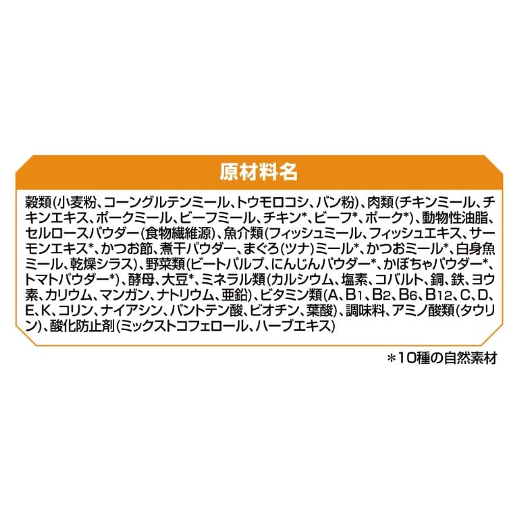 | 穀類(小麦粉、コーングルテンミール、トウモロコシ、パン粉)、肉類(チキンミール、チキンエキス、ポークミール、ビーフミール、チキン*、ビーフ*、ポーク*)、動物性油脂、セルロースパウダー(食物繊維源)、魚介類(フィッシュミール、フィッシュエキス、サーモンエキス*、かつお節、煮干パウダー、まぐろ(ツナ)ミール*、かつおミール*、白身魚ミール、乾燥シラス)、野菜類(ビートパルプ、にんじんパウダー*、かぼちゃパウダー*、トマトパウダー*)、酵母、大豆*、ミネラル類(カルシウム、塩素、コバルト、銅、鉄、ヨウ素、カリウム、マンガン、ナトリウム、亜鉛)、ビタミン類(A、B1、B2、B6、B12、C、D、E、K、コリン、ナイアシン、パントテン酸、ビオチン、葉酸)、調味料、アミノ酸類(タウリン)、酸化防止剤(ミックストコフェロール、ハーブエキス)*10種の自然素材 |