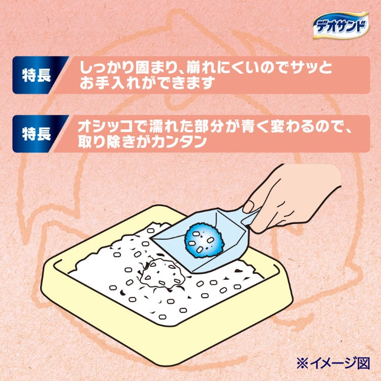2.固まった部分だけスコップ等で取り除き、取り除いた部分と同量のデオサンド香りで消臭する紙砂を補充してください。