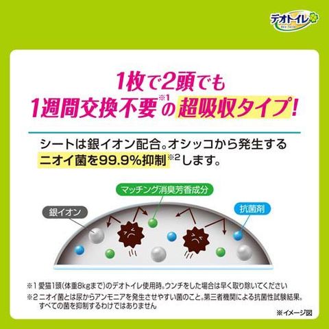 ●1枚で2頭分のオシッコ1週間分を強力に消臭・吸収。 ※愛猫1頭(体重8kgまで)の場合。ウンチをした場合は早く取り除いてください。