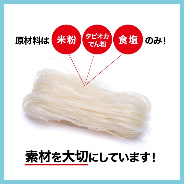 ●米粉とタピオカでんぷんを原料とし、水と塩だけを加えて作られた平打ち麺です。