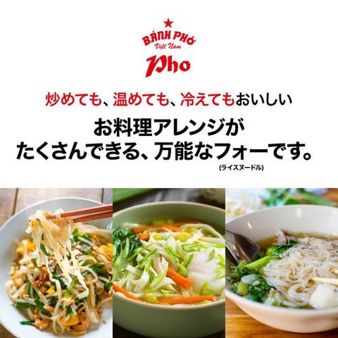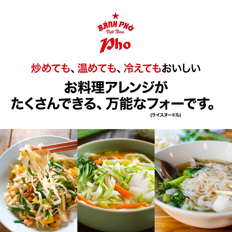●つるつるモチモチとした食感が特徴で、主にベトナムの国民食である「フォー」として、牛や鶏の出汁をベースとしたスープに入れて調理します。ランチやディナーに限らず、本場ベトナムでは朝食として食べることも多く、さまざまなシチュエーションで楽しめる料理です。