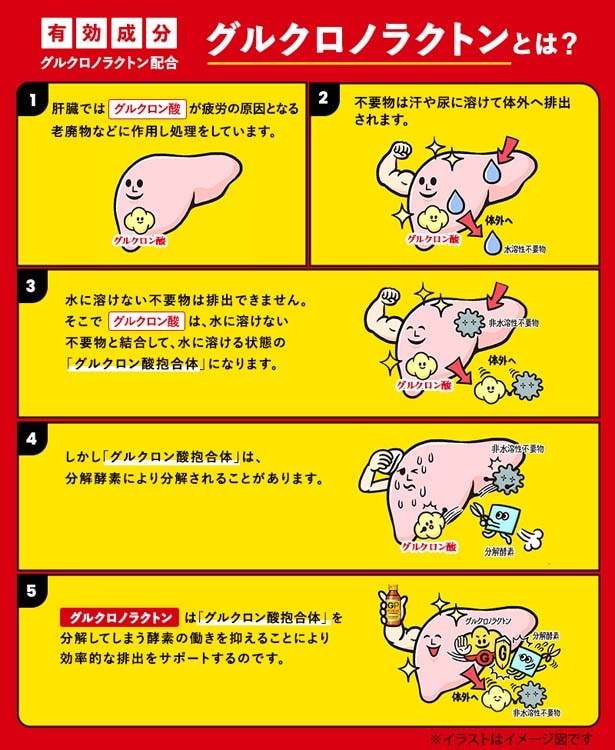 | 1瓶(100ml)中 グルクロノラクトン:1000mg ビタミンB1硝酸塩:10mg ビタミンB2リン酸エステル:5mg ビタミンB6:5mg ニコチン酸アミド:20mg イノシトール:100mg カルニチン塩化物:100mg 無水カフェイン:30mg リュウガンニクエキス(植物由来の生薬):9mg(原生薬換算量30mg) ジクロロ酢酸ジイソプロピルアミン:3mg 添加物:リンゴ果汁、ハチミツ、ブドウ糖、果糖ブドウ糖液糖、乳酸、安息香酸Na、香料、バニリン、エタノール、プロピレングリコール、グリセリン |