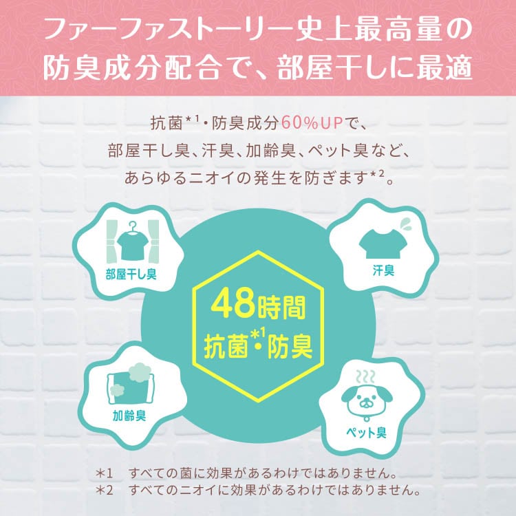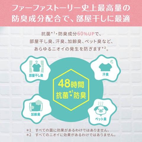 ●ファーファストーリーは防臭成分配合で、部屋干しに最適。部屋干し臭、汗臭、加齢臭、ペット臭など、あらゆるニオイの発生を防ぎます※。