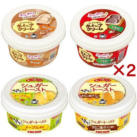 | パンにぬるホイップクリーム ピーナッツ:150g×2個、パンにぬるホイップクリーム チョコ:150g×2個、シュガートースト メープル風味:100g×2個、シュガートースト きなこ揚げパン風味:100g×2個 計4種8個 |