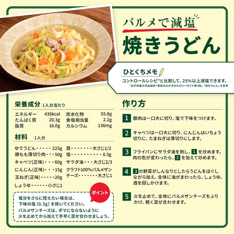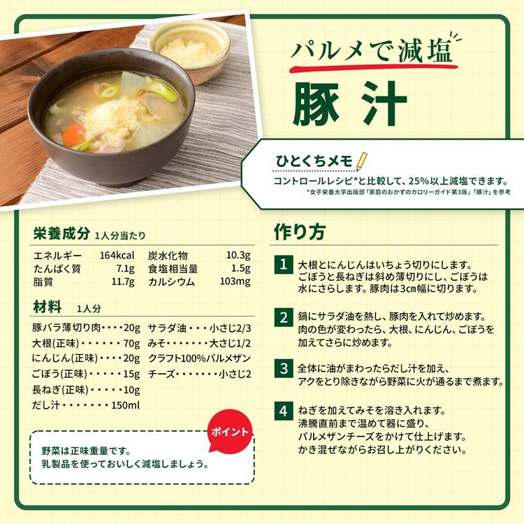 | 1食(5g)当たり エネルギー:24kcal、炭水化物:0-0.3g、たんぱく質:2.2g、食塩相当量:0.1-0.3g、脂質:1.6g、カルシウム:72mg |