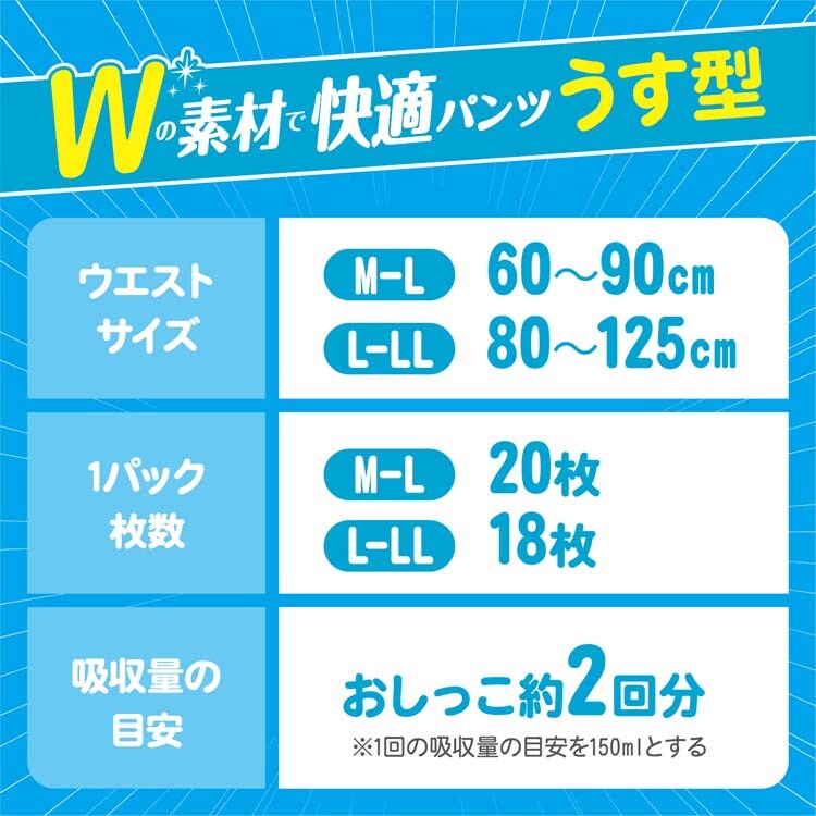 ●吸収量の目安:おしっこ約2回分(1回の排尿量 約150ml)