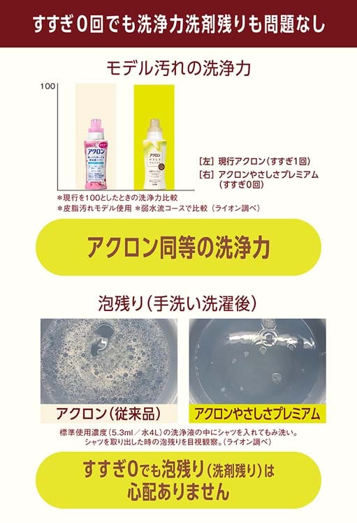 ・すすぎ1回時のシワ・ヨレ・型崩れ防止効果は「アクロン」と同程度です。