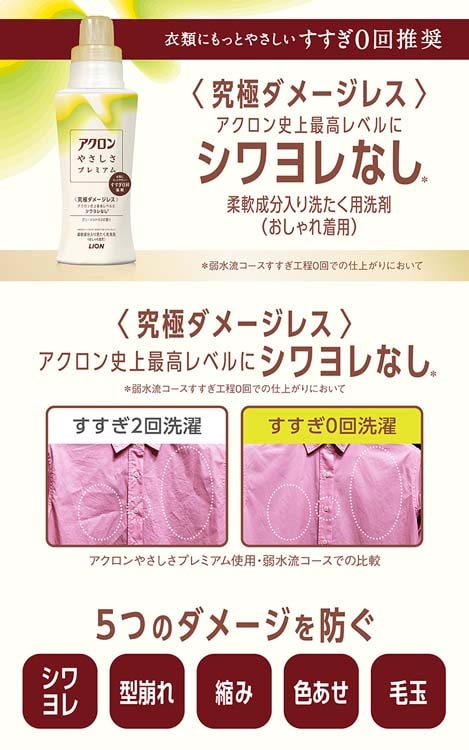 ・すすぎ1回時のシワ・ヨレ・型崩れ防止効果は「アクロン」と同程度です。