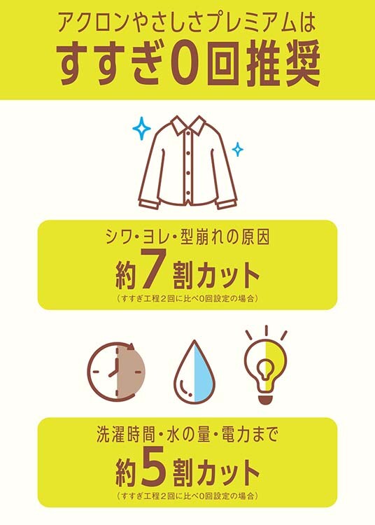 ●洗濯工程の7割を占め、衣類ダメージの原因である「すすぎ」をなくす技術で、衣類へ究極にダメージを与えず洗い上げ、アクロン史上最高レベルのプレミアムな仕上がりを実現!