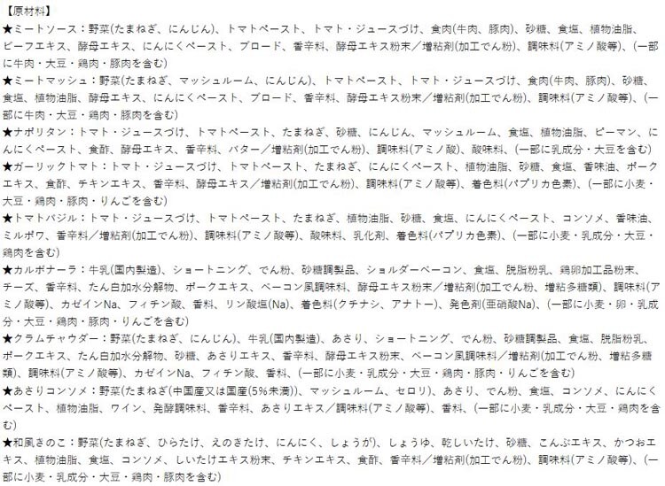 | ★ミートソース:牛肉・大豆・鶏肉・豚肉 ★ミートマッシュ:牛肉・大豆・鶏肉・豚肉 ★ナポリタン:乳成分・大豆 ★ガーリックトマト:小麦・大豆・鶏肉・豚肉・りんご ★トマトバジル:小麦・乳成分・大豆・鶏肉 ★カルボナーラ:小麦・卵・乳成分・大豆・鶏肉・豚肉・りんご ★クラムチャウダー:小麦・乳成分・大豆・鶏肉・豚肉・りんご ★あさりコンソメ:小麦・乳成分・大豆・鶏肉 ★和風きのこ:小麦・乳成分・大豆・鶏肉・豚肉 |