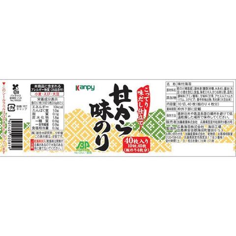 | 乾のり(韓国産)、調味液(糖類(砂糖、水あめ)、醤油(大豆・小麦を含む)、食塩、海老エキス、かつお削り節、昆布)/調味料(アミノ酸等)、甘味料(甘草、アセスルファムカリウム、ステビア)、香辛料抽出物、乳化剤(大豆由来) |
