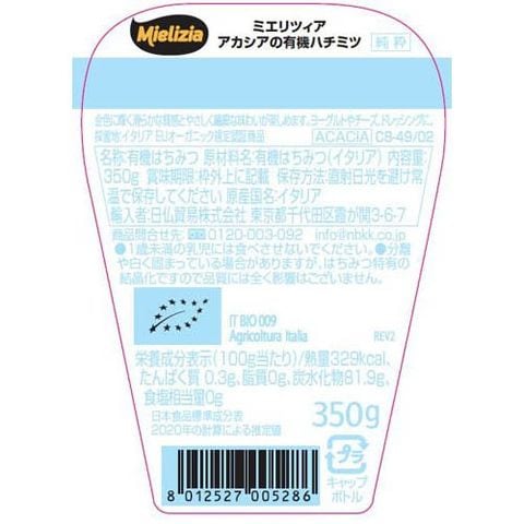 ●Mielizia(ミエリツィア):イタリアの養蜂協同組合CONAPIが手掛けるハチミツブランド。「おいしいハチミツ」という意味合いが込められています。生産者(養蜂家)や採蜜地が明確であるのも大きな特徴です。Mielizia(ミエリツィア)では、採蜜地から集められたハチミツに一切何も加えてはならず、全ての工程を40度前後の低温で処理するという非加熱ハチミツそのもので、高温処理されたものと比べて本来持っている風味や香り、質感が保たれています。コナピ社は1979年にイタリア、ボローニャ近郊に設立されました。