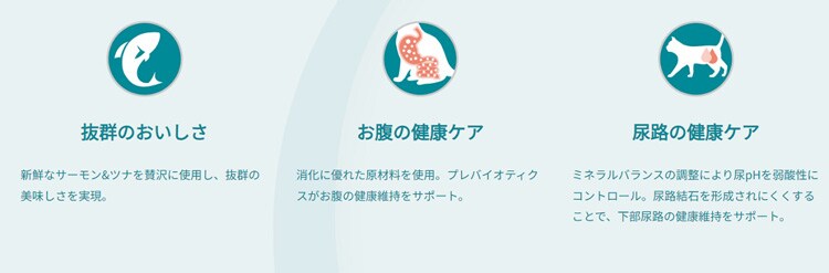 | フィッシュ(サーモン、ツナ)(オメガ3脂肪酸源)、とうもろこし、とうもろこしたんぱく、チキンミール、米、小麦たんぱく、小麦、鶏脂(オメガ6脂肪酸源)、大豆粉、フィッシュミール、たんぱく加水分解物、可溶性食物繊維(プレバイオティクス源)、酵母(βグルカン源)、ミネラル類(カルシウム、リン、カリウム、ナトリウム、クロライド、マグネシウム、鉄、銅、マンガン、亜鉛、ヨウ素、セレン)、ビタミン類(A、D、E、K、B1、B2、パントテン酸、ナイアシン、B6、葉酸、ビオチン、B12、コリン、C)、アミノ酸類(メチオニン、タウリン)、カラメル色素 |