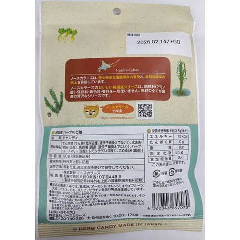| てん菜糖(てん菜(北海道産、遺伝子組換えでない))、水あめ(甘藷(国産)、馬鈴薯(国産、遺伝子組換えでない))、ハーブ(ローズマリー(国産)、レモングラス(国産))、こめ油(米(国産)) |