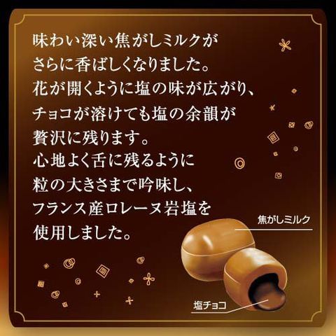 ●香ばしリッチ製法:焦がしミルクの味わいがしっかり伝わるように、ミルクキャンディをじっくり炊き込みました。焦がしミルクの香ばしい味わいが、チョコの風味を引き立てます。