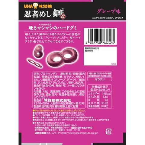 ●グレープ味:グミの中でも人気の高いフレーバーです。忍者めし鋼の噛みしめる食感にしっかりとしたグレープの味わいがクセになります。