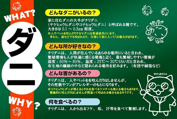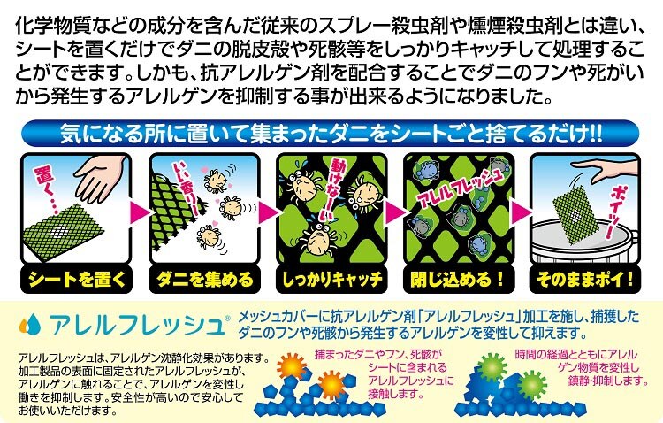 ●化学物質などの成分を含んだスプレー殺虫剤や燻煙殺虫剤とは違い、シートを置くだけでダニの脱皮殻や死骸等をしっかりキャッチして処理することができます。
