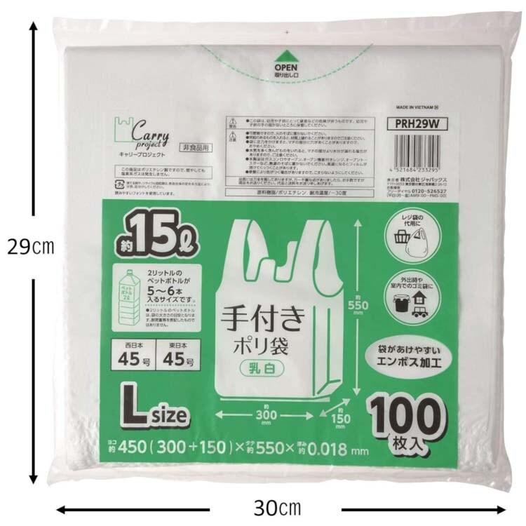 ジャパックス 手付き ポリ袋 L 約15L 乳白 PRH29W 厚み:0.018mm (100枚入×3セット)
