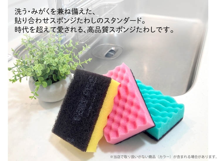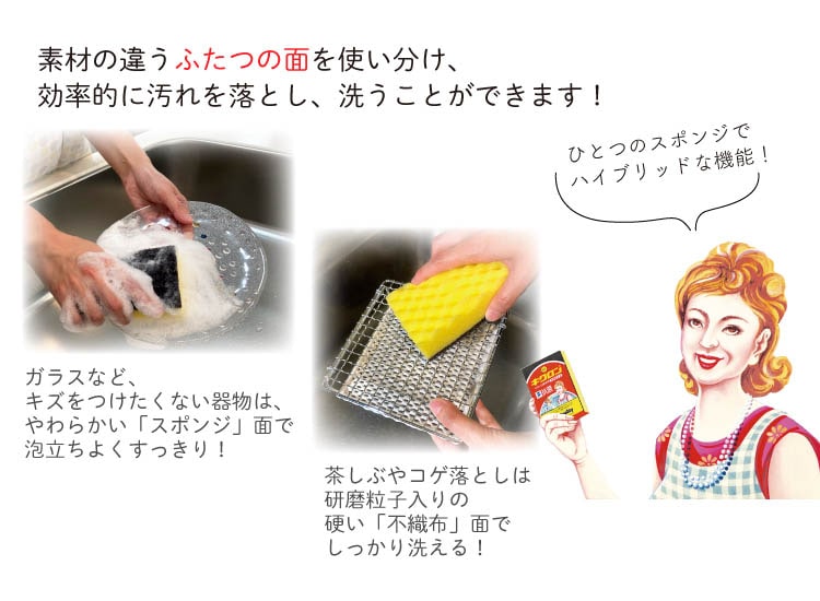 ●あらゆる食器洗いに、研磨粒子入不織布と、泡立ちが良く丈夫なスポンジを使用しています。みがき、あらい、用途に応じて両面使い分けできます。