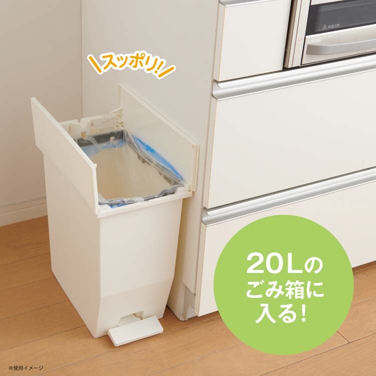 ●20Lひも付きごみ袋。ひもで結べる分、袋サイズ(リッター表記)より沢山のゴミが入る。