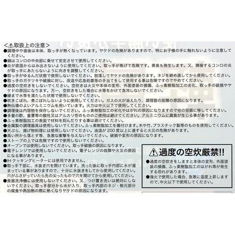 ・炎が底面からはみ出さないように使用してください。取っ手が焦げて危険です。異臭も発生します。又、隣接するコンロの炎が取っ手にあたらないように向きを調整してください。