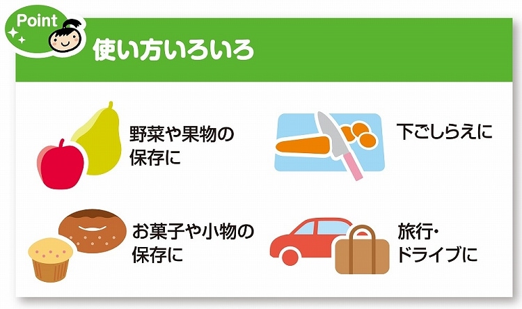 ●野菜や果物の保存、お菓子や小物の保存、下ごしらえ、旅行・ドライブなどにご使用いただけます。