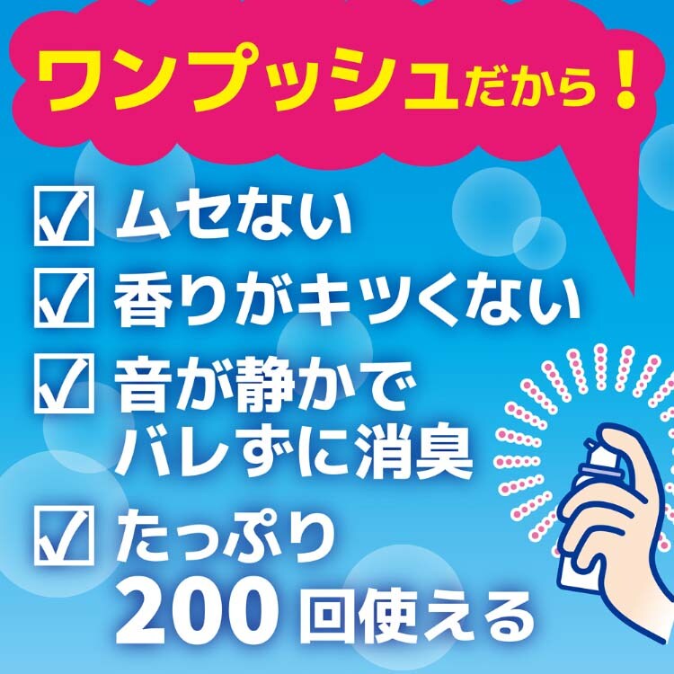 ・トイレの使用前や使用後のニオイに、トイレの空間に向けて1プッシュしてください。広いトイレではプッシュ数を増やしてください。(噴射はななめ上に出ます。)
