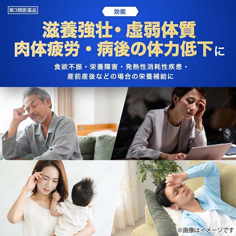 | ・滋養強壮 ・虚弱体質 ・肉体疲労・病後の体力低下・食欲不振・栄養障害・発熱性消耗性疾患・産前産後などの場合の栄養補給 |