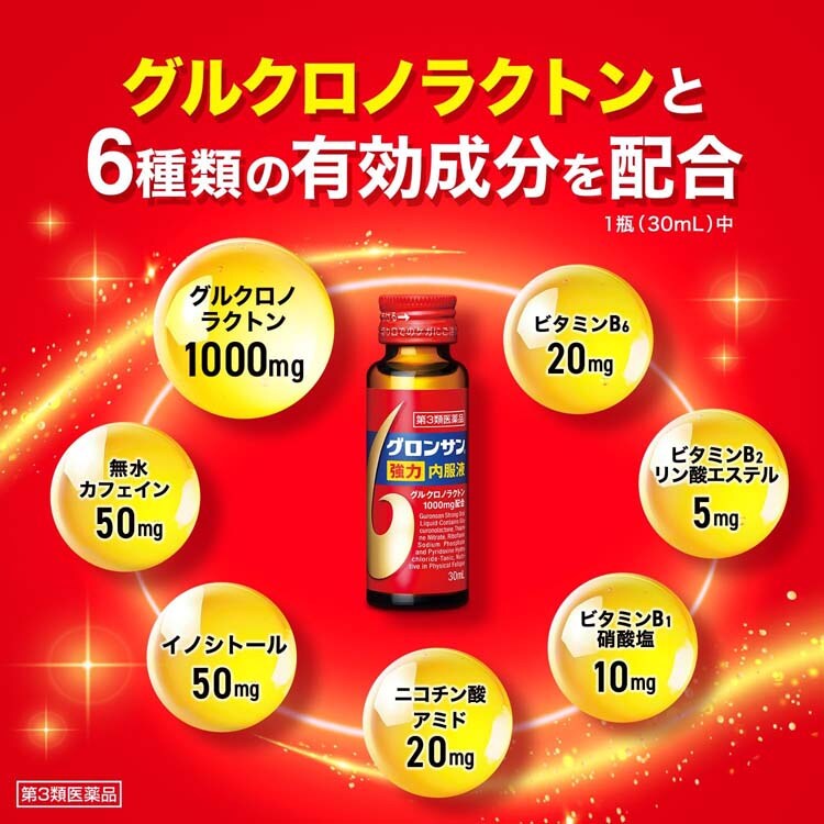 ●グルクロノラクトンに加え、ビタミンB群をはじめとする6種類の有効成分を配合したドリンク剤です。