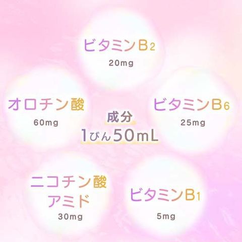 | 1瓶(50mL)中の成分 ビタミンB2リン酸エステル 20mg、ビタミンB6 25mg、ビタミンB1硝酸塩 5mg、ニコチン酸アミド 30mg、オロチン酸 60mg 添加物として、安息香酸Na、クエン酸、クエン酸Na、バニリン、パラベン、プロピレングリコール、香料、アセスルファムK、エリスリトール、スクラロース、没食子酸プロピル、DL-リンゴ酸(アルコール0.1mL以下) ・本剤は内容成分が浮遊・沈殿することがありますが、効果には変わりありません。 ・本剤の服用により、尿が黄色くなることがありますが、これは本剤に含まれているビタミンB2が吸収され、その一部が尿中に排泄されるためで心配はありません。 |