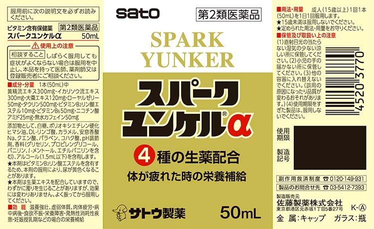 | 1本(50mL)中 黄精流エキス 300mg・イカリソウ流エキス 300mg・大棗エキス 120mg・ローヤルゼリー 50mg・タウリン 500mg・ビタミンB2リン酸工ステル 10mg・ビタミンB6 50mg・ニコチン酸アミド 25mg・無水カフェイン 50mg 添加物として、白糖、ポリオキシエチレン硬化ヒマシ油、DL-リンゴ酸、カラメル、安息香酸Na、クエン酸、パラベン、コハク酸、pH調節剤、香料 (グリセリン、プロピレングリコール、バニリン、L-メントール、エチルバニリンを含む)、アルコール(1.5mL以下)を含有します。 ・本剤はビタミンB2リン酸エステルを含有するため、本剤の服用により、尿が黄色くなることがあります。 ・本剤は生薬エキスを配合していますので、わずかに濁りを生じることがありますが、効果には変わりありません。よく振ってから服用してください。 |