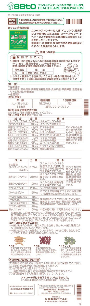 ●ユンケルファンティは人参、イカリソウ、蛇床子などの植物性生薬と反鼻、ローヤルゼリー、シベットなどの動物性生薬16種類に各種ビタミンを配合したドリンクです。